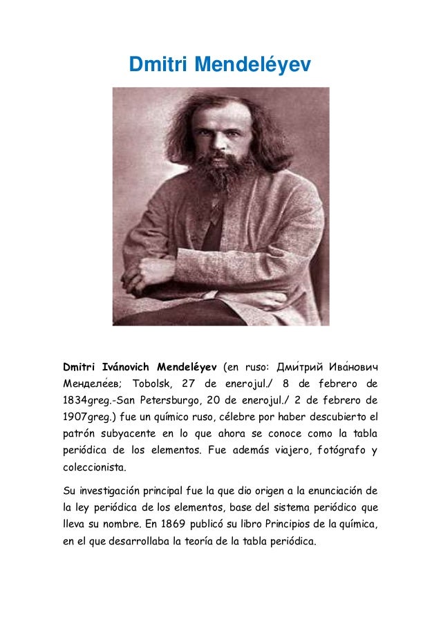 Propone la ley de las octavas que señalaba que cada ocho elementos se encuentran propiedades similares. 1Identidad y familia2Exprecion y acceso a la informacion3Proteccion contra el abuso y la discriminacion4Educa. El mendelevio tomó su nombre gracias al gran químico ruso Dimitri Ivánovich Medeléiev Tobolsk 1834- San Petersburgo 1907 que publicó en 1869 la primera versión de la tabla periódica moderna ordenando los elementos químicos en orden creciente según su peso atómico.