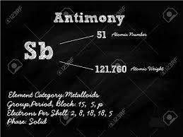 Antimonio en la tabla periodica. Elemento número 51 de la Tabla Periódica de los Elementos - Química - Marco cuadrado verde con fondo negro sin royalties 130882700 de la colección de millones de fotos imágenes vectoriales e ilustraciones de stock de alta resolución de Depositphotos. Antimonio Tabla periódica Propiedades atómicas El antimonio es un metaloide gris brillante se encuentra en la naturaleza principalmente como estibina mineral de sulfuro. Es un semimetal duro y quebradizo color blanco plateado.