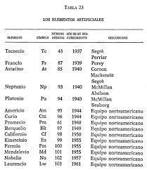 Las tablas periódicas y los libros de texto generalmente indican que el tecnecio el prometio y todos los elementos transuránicos son artificiales hechos por el hombre pues no existen en la naturaleza. En la Tabla periódica hay varios elementos que no existen en la naturaleza entre paréntesis el año de su primera creación o descubrimiento. Esa tabla tenía aproximadamente 62 elementos naturales.