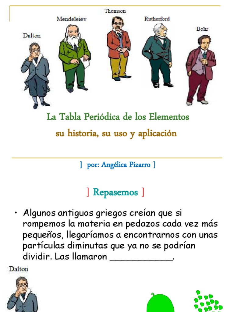 Historia de la tabla periodica para niños de primaria. Menciona e identifica las partculas sub-atmicas. Anglica Pizarro Repasemos Algunos antiguos griegos crean que si rompemos la materia en pedazos cada vez ms pequeos llegaramos a encontrarnos con unas partculas diminutas que ya no se podran dividir. La Tabla Peridica de los Elementos su historia su uso y aplicacin por.