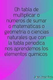 Poema con los elementos de la tabla periodica. Favor leer con urgencia o que Dios les pille confesados. Un químico las utiliza mientrasotros las aprenden desde hidrógeno a helio una tabla completó. 57 La Lantano 13891.
