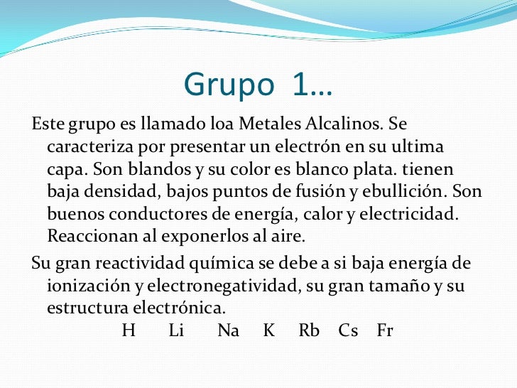 No pertenece a ningún grupo está recuadrado solo en la Tabla Periódica. Obtención de los óxidos 1 Universidad del atlántico Química Inorgánica Laboratorio 5 Propiedades de los elementos del grupo 1 y 2 de la tabla periódica Fiorella Lobatón Emily Cassiani Margie Marriaga Metálicos. Grupo IA Metales Alcalinos Los metales alcalinos se encuentran en la primera columna grupo IA de la tabla periódica.