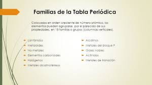 Se le denomina grupo o familia a las columnas verticales de la tabla periódica. Son las filas horizontales de la tabla. Los elementos de la tabla periódicase clasifican en familias también llamadas Grupos porque las tres categorías principales de los elementos metales no metales y metaloides son muy amplias.