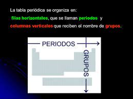 Reciben este nombre por agrupar elementos de propiedades químicas similares. Grupo 1 I A. La tabla periódica se organiza en filas dirección horizontal que se llaman Periodos y columnas dirección vertical que reciben el nombre de Grupos o familias además por facilidad de representación aparecen dos filas horizontales fuera de la tabla que corresponden a elementos que deberían ir en el sexto.