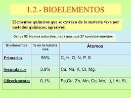 Bajo esta denominación se agrupan los que forman parte de todos o de alguno de los tipos principales de biomoléculas orgánicas. Bioelementos secundariosLos bioelementos secundarios se clasifican en dos grupos. 2 He 2.