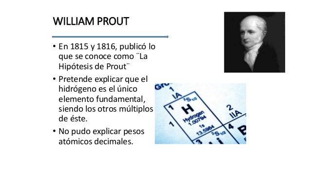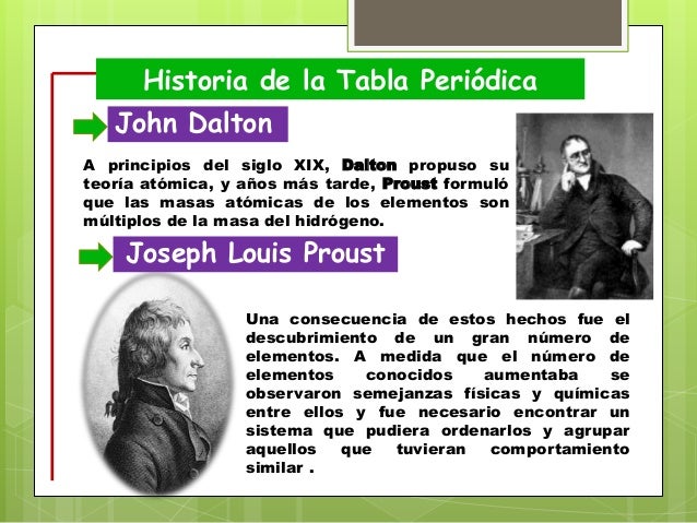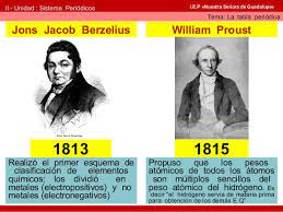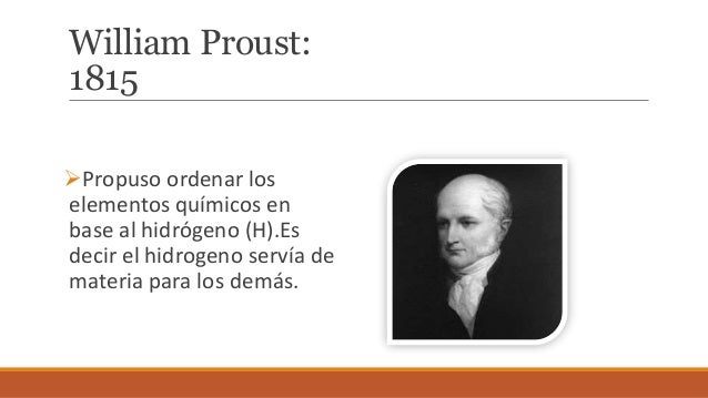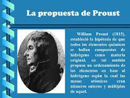 La propuesta de Proust William Proust 1815 estableci la hiptesis de que todos los elementos qumicos se hallan compuestos de hidrgeno como materia original en tal sentido propuso un ordenamiento de los elementos en base al hidrgeno segn la cual las masas atmicas eran nmeros enteros y mltiplos de aquel. La ley de Proust contradecía las conclusiones del químico francés Claude Louis Berthollet quien defendía que las proporciones en la que se combinaban los elementos en un compuesto dependían de las condiciones de su síntesis. Cuando él estaba en sus Newlands dispuso a los elementos en filas horizontales de 7 en 7 de lo que tempranos 20 años midió y trazó las frecuencias de rayos X de alrededor de resultaban periodos en los que el octavo elemento se parecía en propiedades al 40 elementos de la tabla periódica.